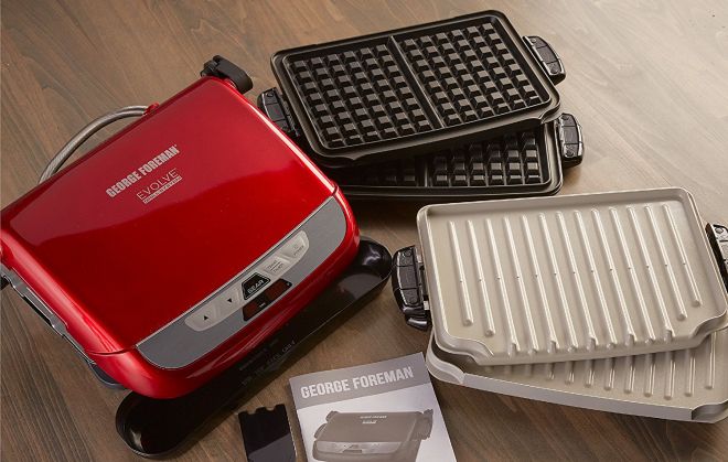 Head over to Amazon where you can score this George Foreman 5-Serving Multi-Plate Evolve Grill System (in Red), for just $59 + FREE Shipping (regularly $120)! The 3-in-1 capabilities and simple digital controls will change the way you prepare food. Use the durable ceramic grill plates for your traditional grilling needs with steak, chicken, fish, and vegetables and use waffle plates to make a breakfast for the family. You can even lay the grill flat for making grilled sandwiches! Order yours now!